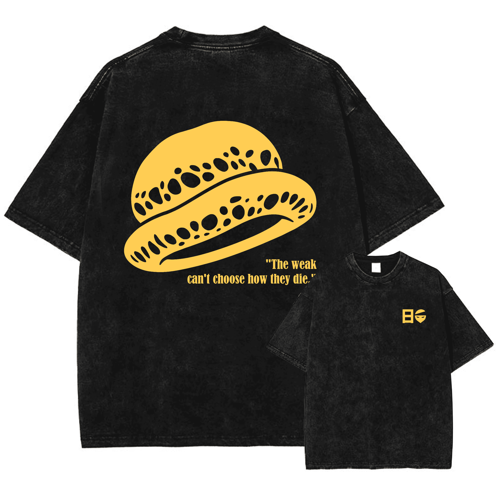 This oversized tee showcases one of Trafalgar Law’s most recognizable symbols — his iconic spotted hat — paired with one of his coldest lines: “The weak can’t choose how they die.” A clean, bold design that captures Law’s ruthless honesty and sharp presence without overcomplicating the aesthetic.