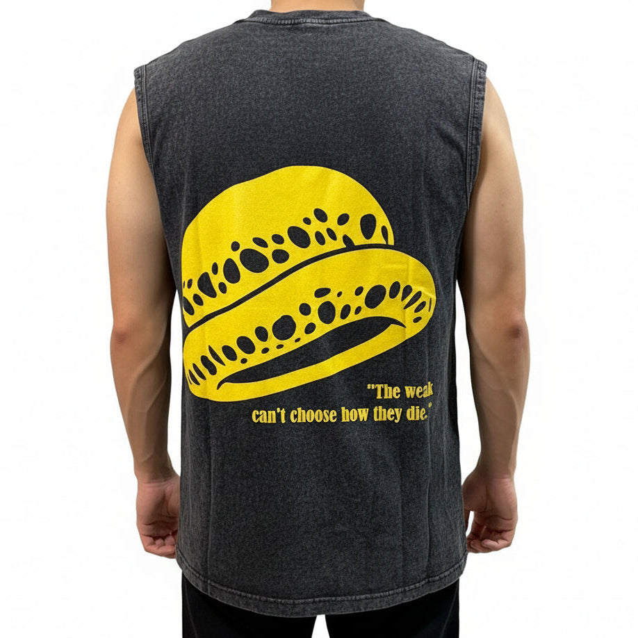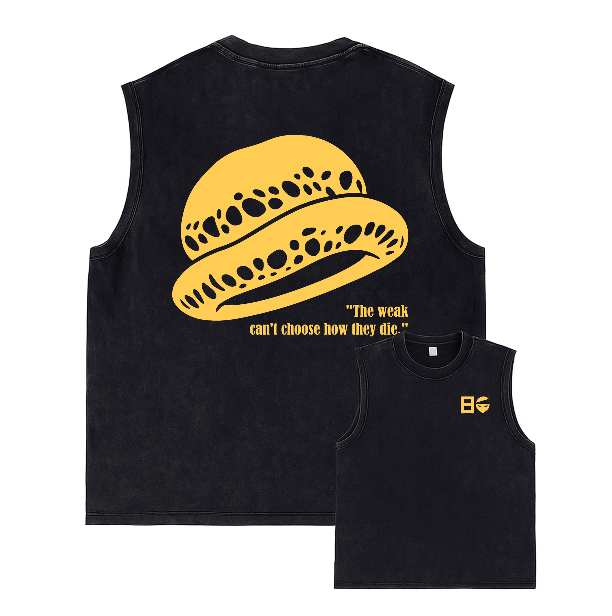 This tank top showcases one of Trafalgar Law’s most recognizable symbols — his iconic spotted hat — paired with one of his coldest lines: “The weak can’t choose how they die.” A clean, bold design that captures Law’s ruthless honesty and sharp presence without overcomplicating the aesthetic.